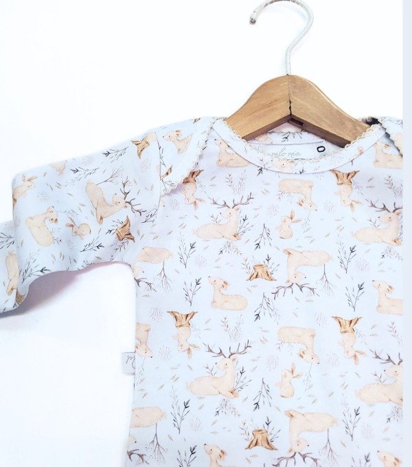 Body modelo americano estampa de ciervitos en colores beige y tostados. Fondo celeste aero