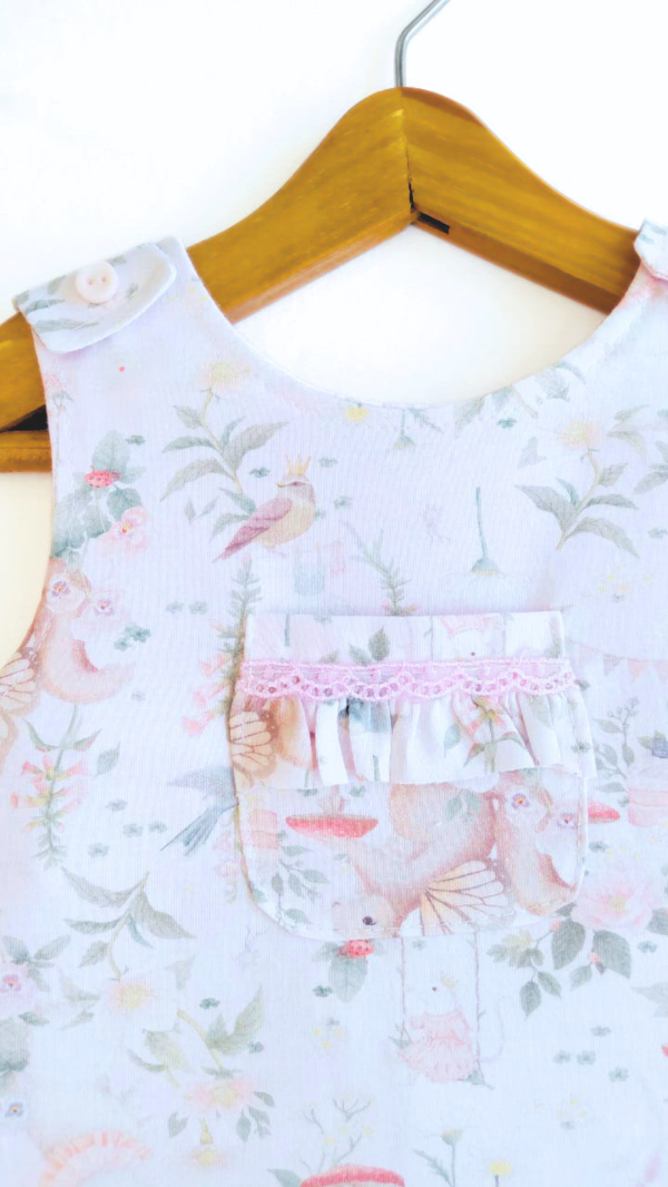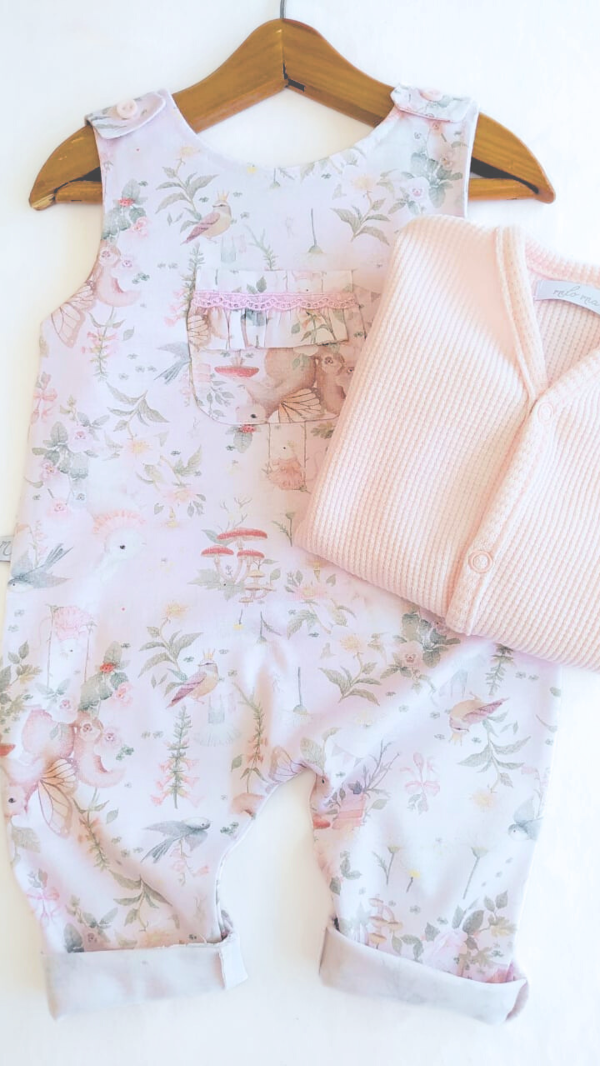 Jardinero estampa ¨Ofelia Rosa¨ con breteles con botón al tono